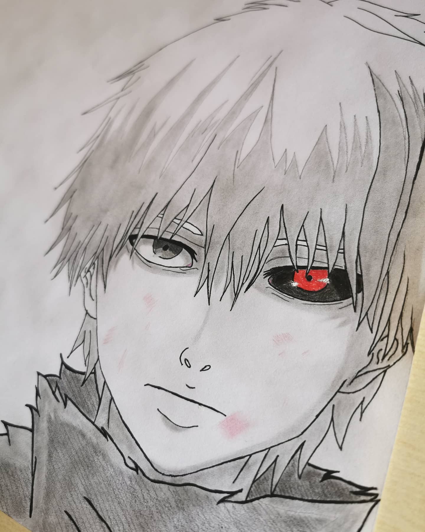 In the anime, tokyo ghoul, his hair changes instantly after eating rize and accepting his ghoul side.